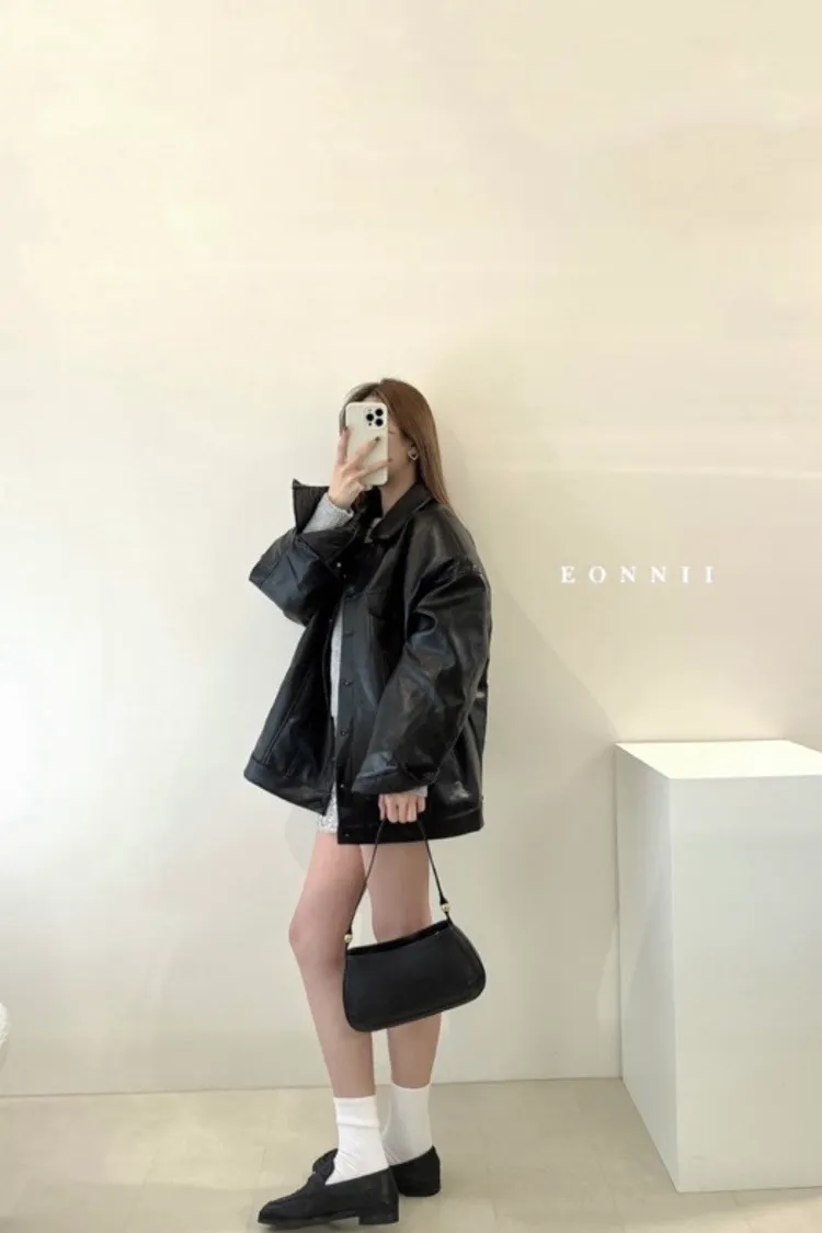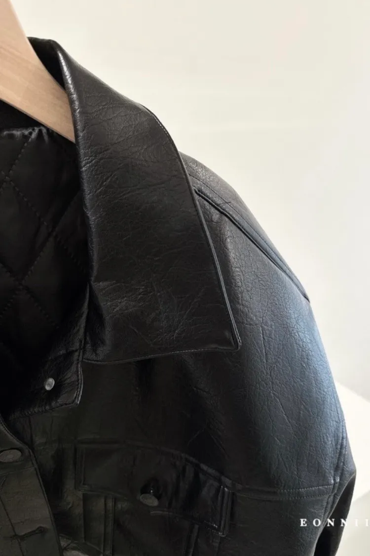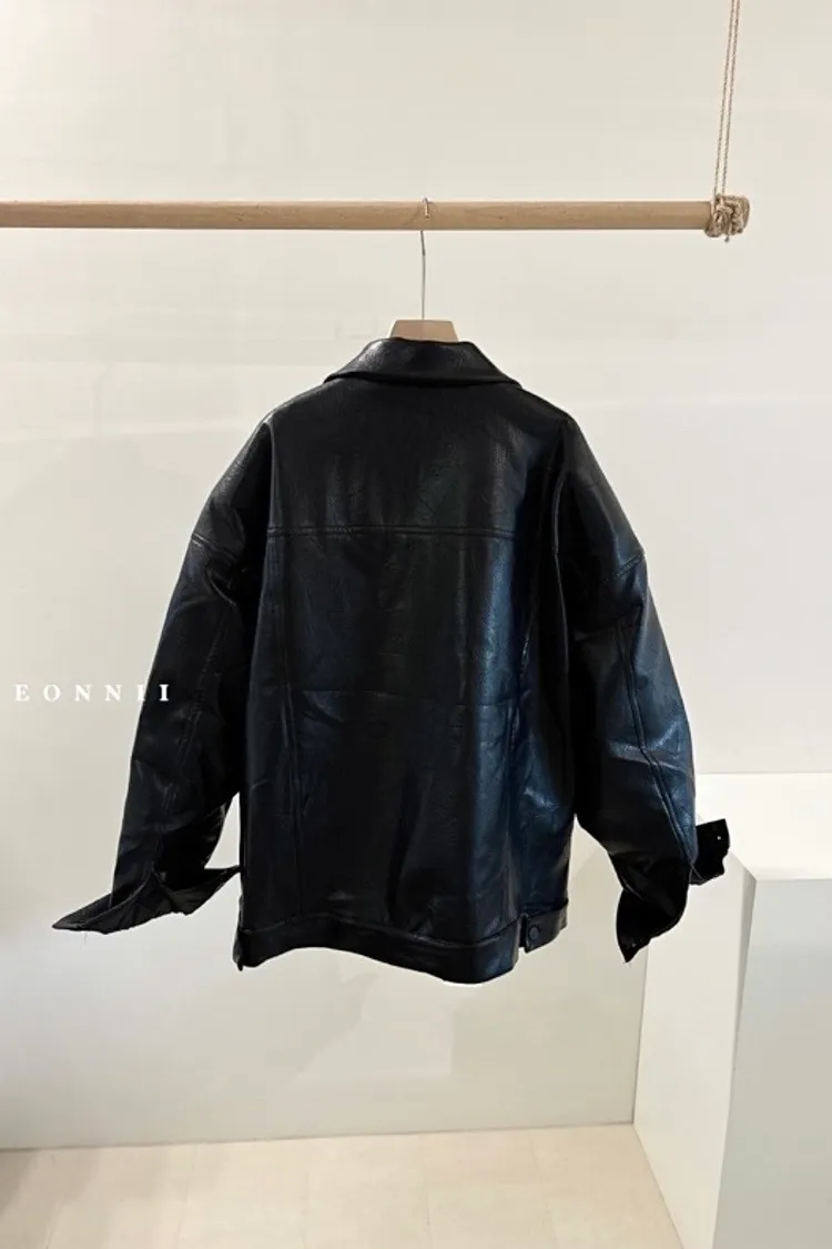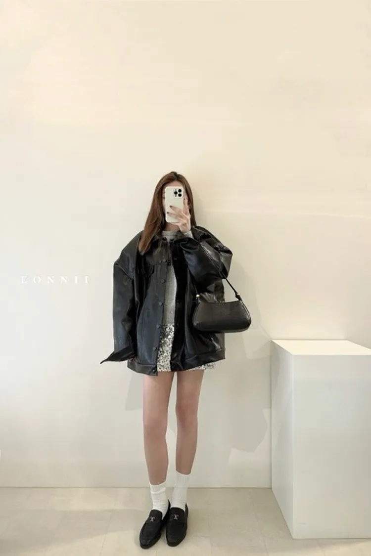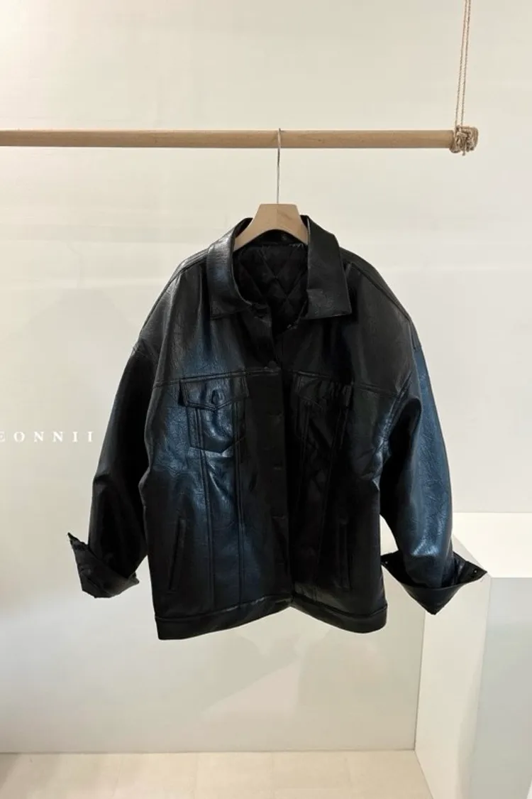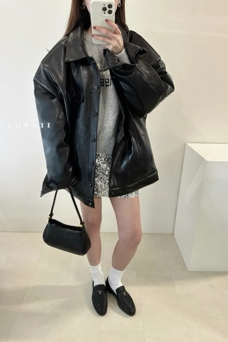 冬𝐧𝐞𝐰🍁oversize墊肩皮革外套,黑