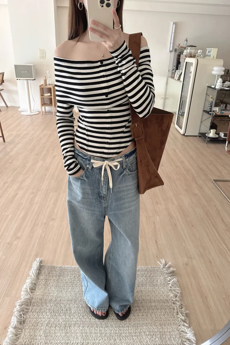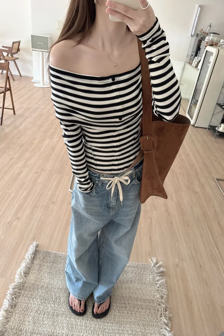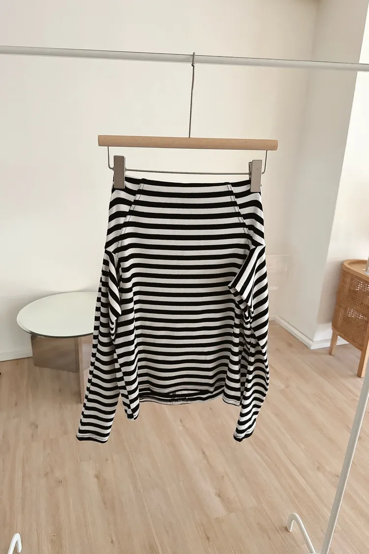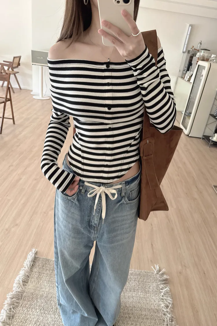 秋𝐧𝐞𝐰🍂條紋露肩圓弧下擺上衣(現貨)
