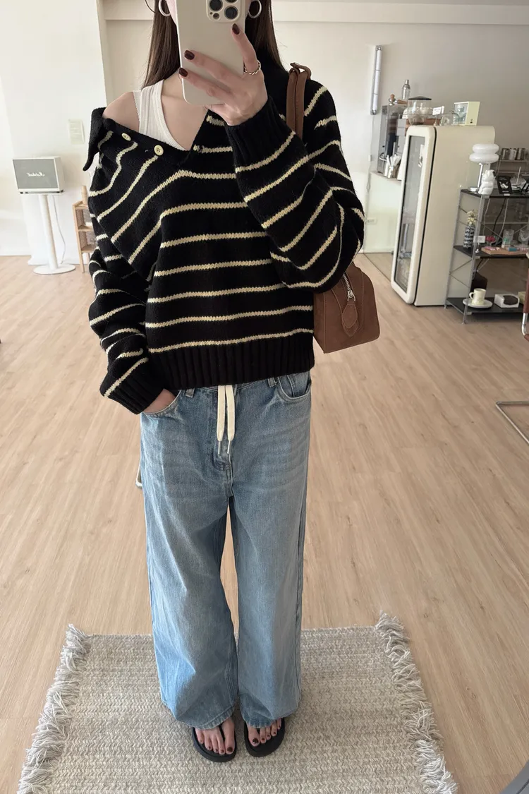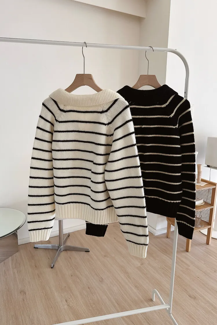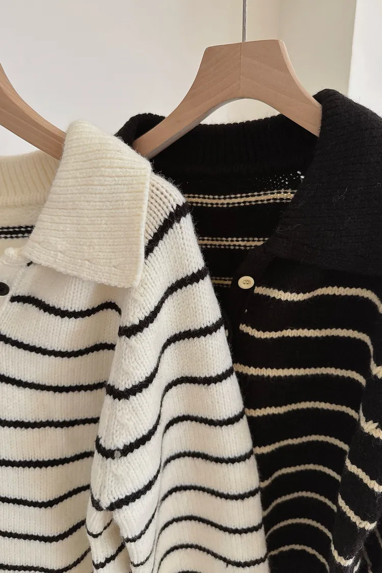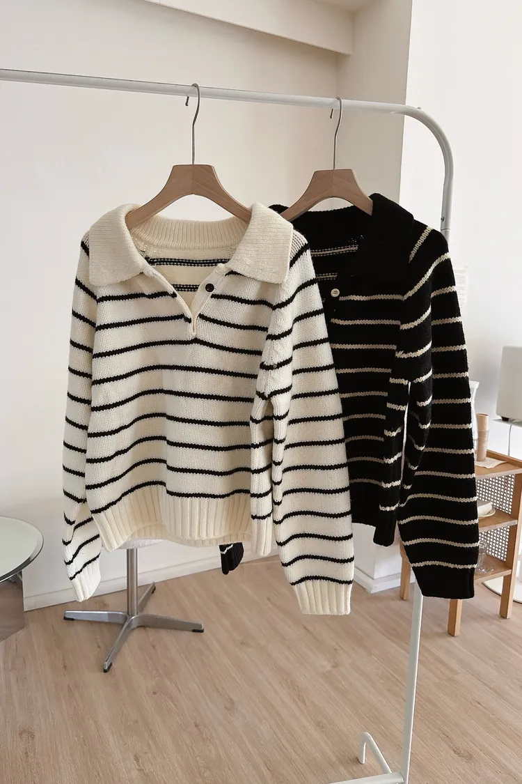 秋𝐧𝐞𝐰🍂條紋翻領針織衣,米/黑