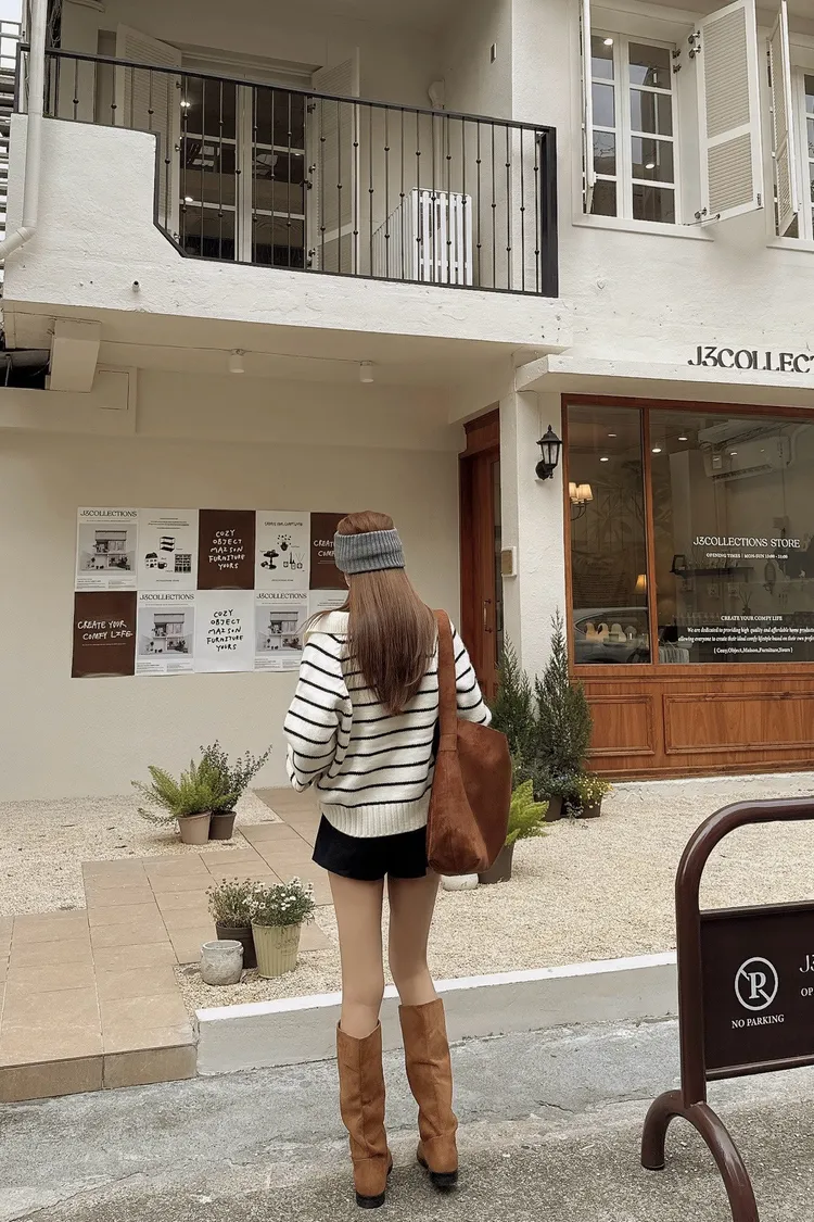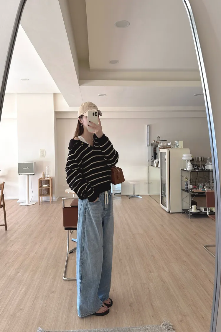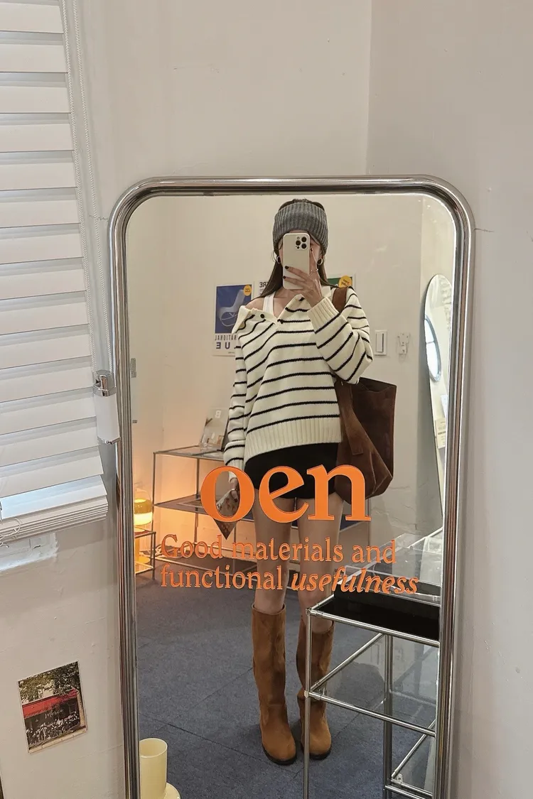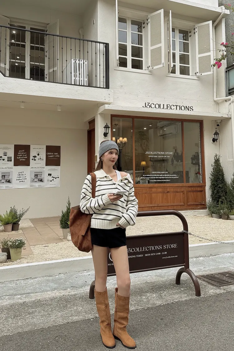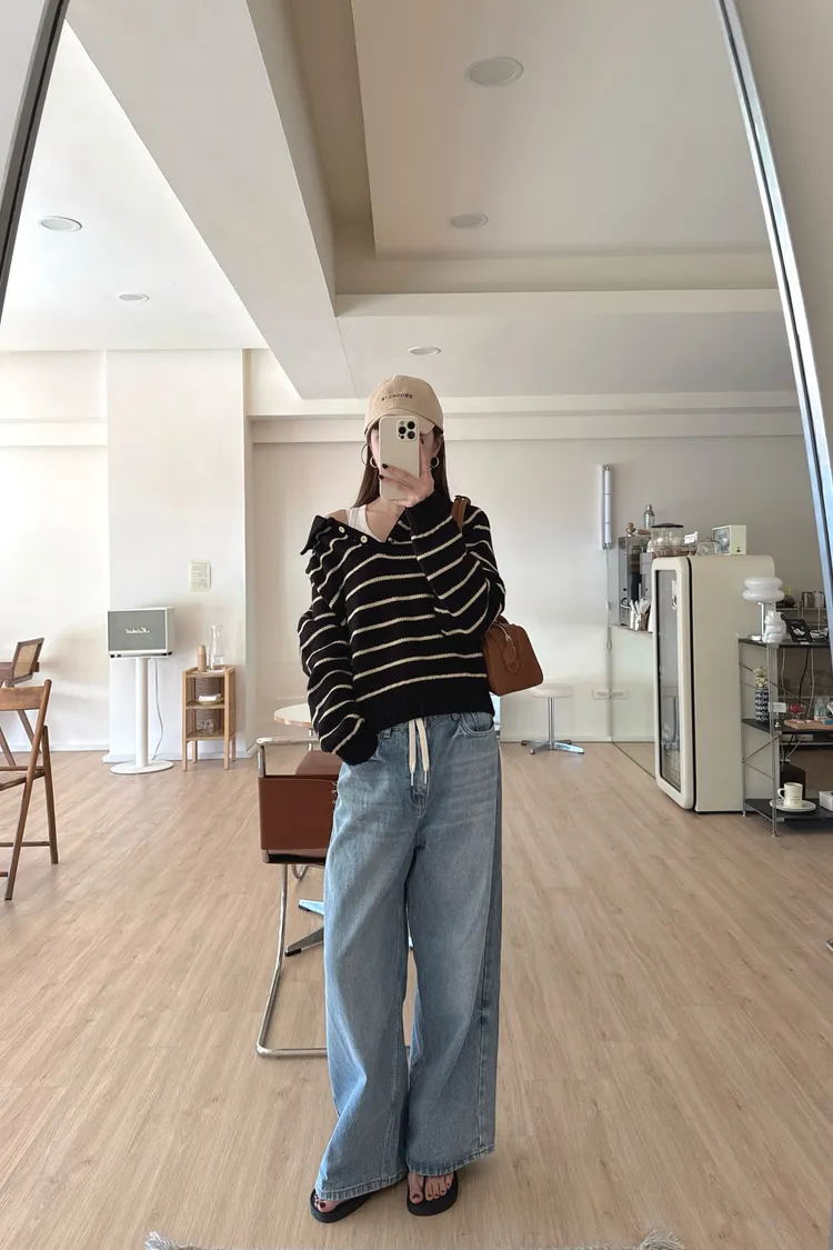 秋𝐧𝐞𝐰🍂條紋翻領針織衣,米/黑