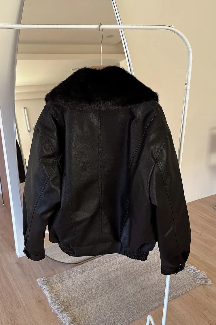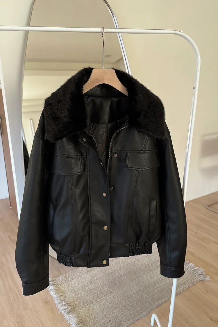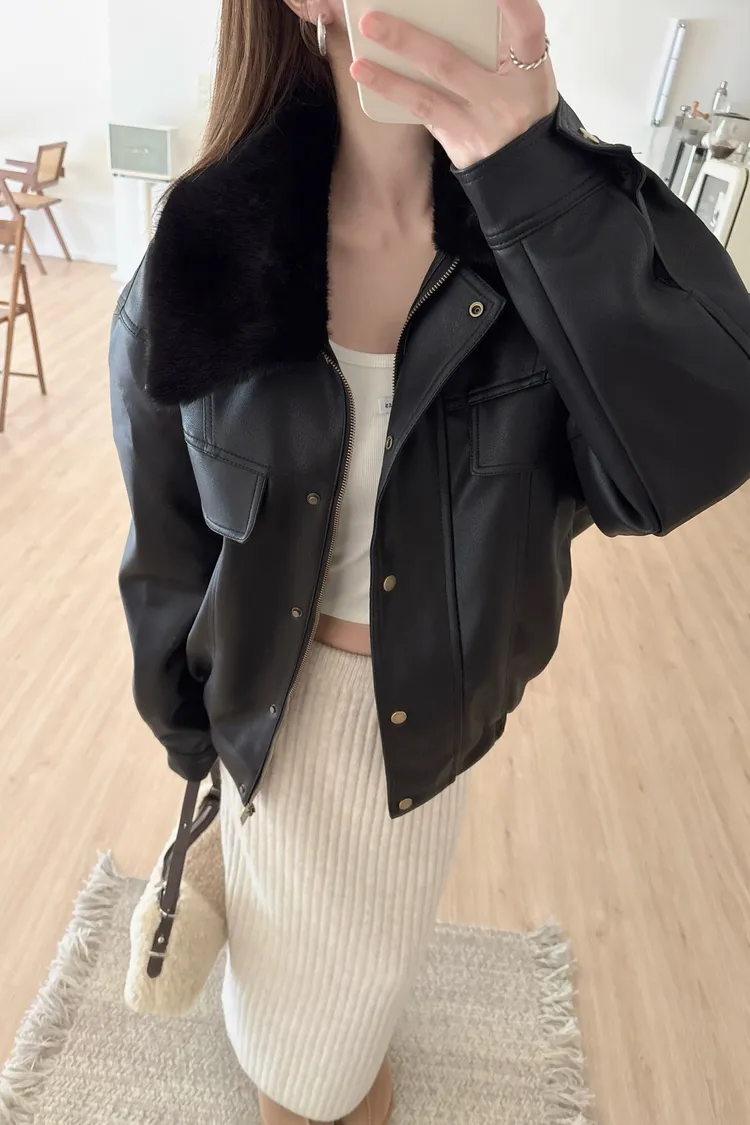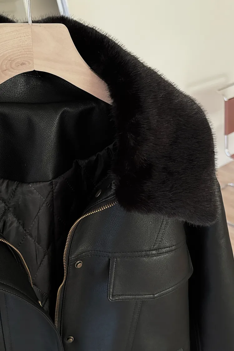 冬𝐧𝐞𝐰🍁毛領可拆皮革外套,黑