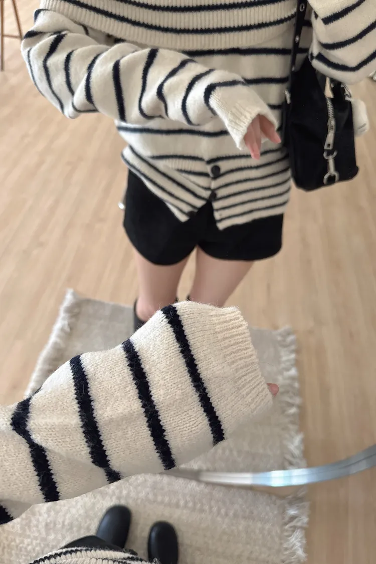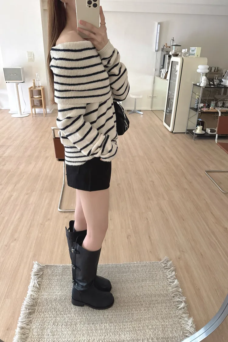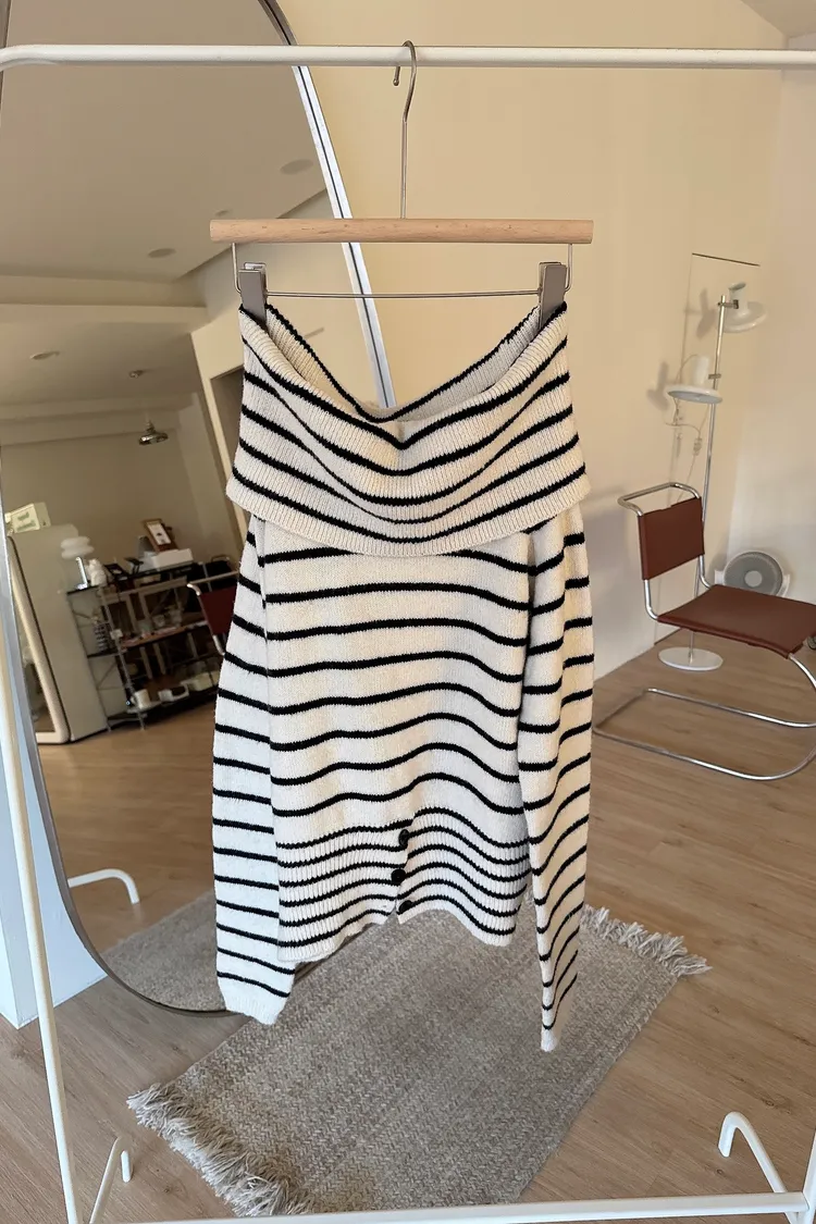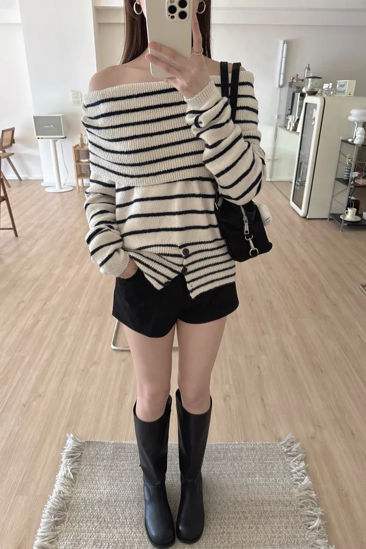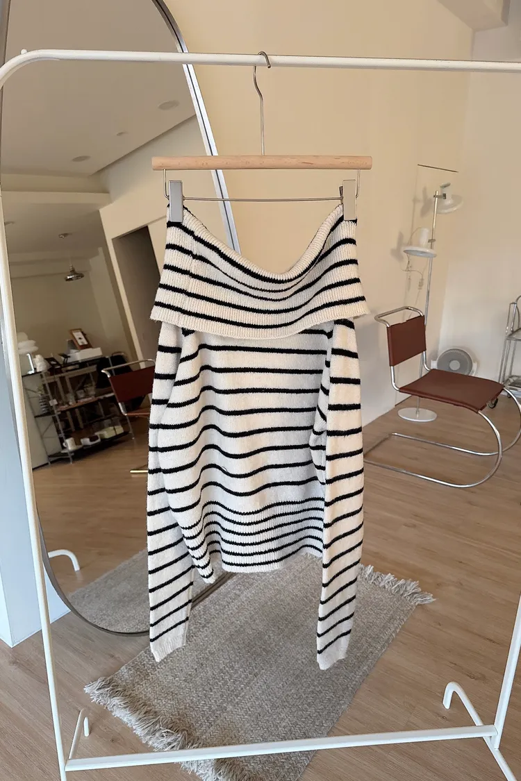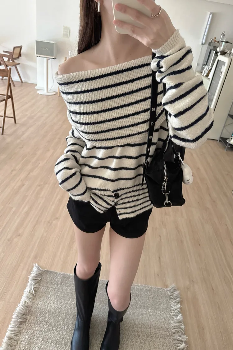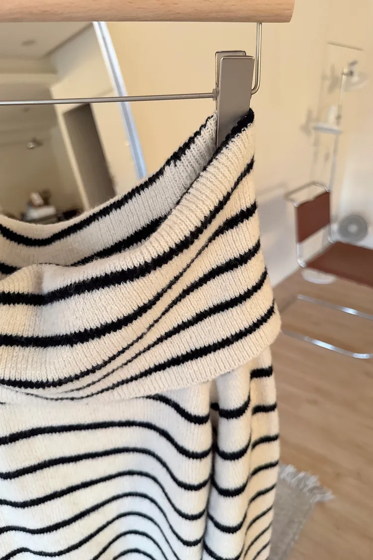 冬𝐧𝐞𝐰🍁條紋露肩針織衣,杏