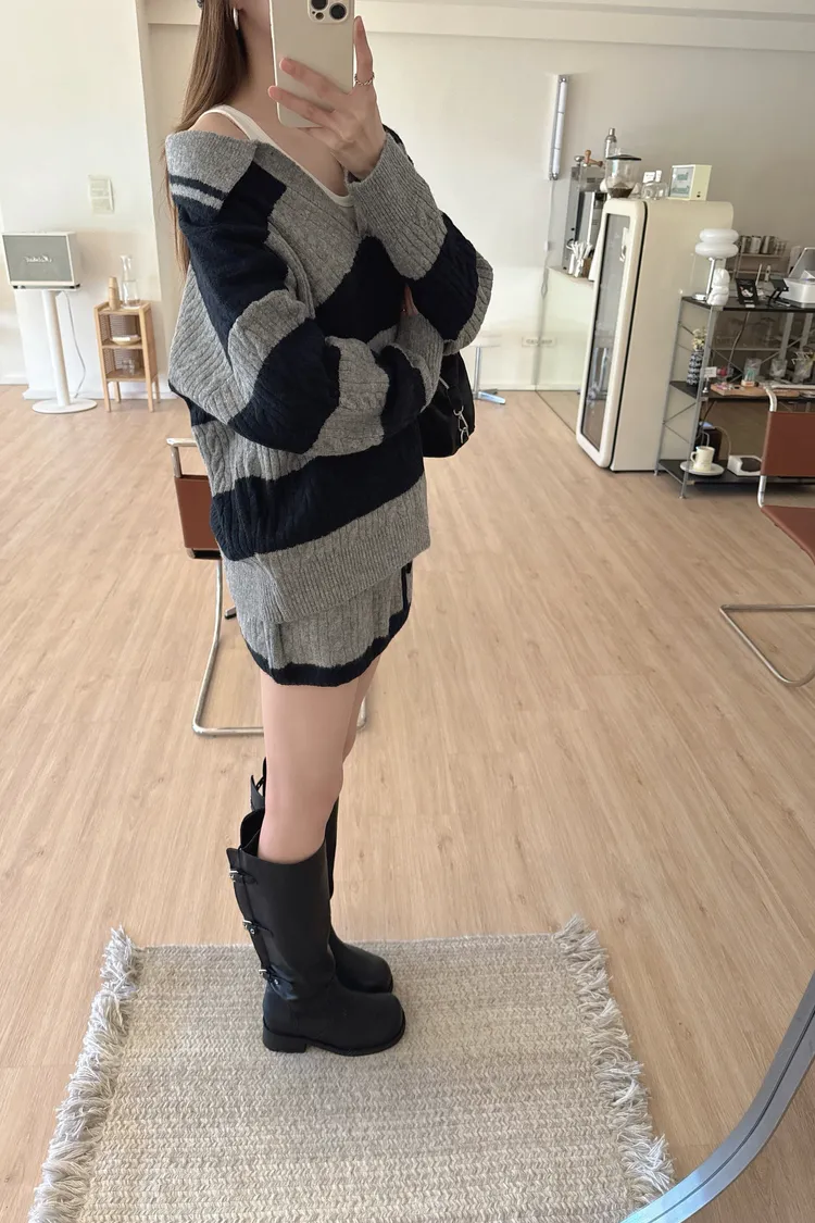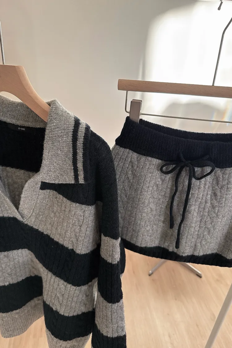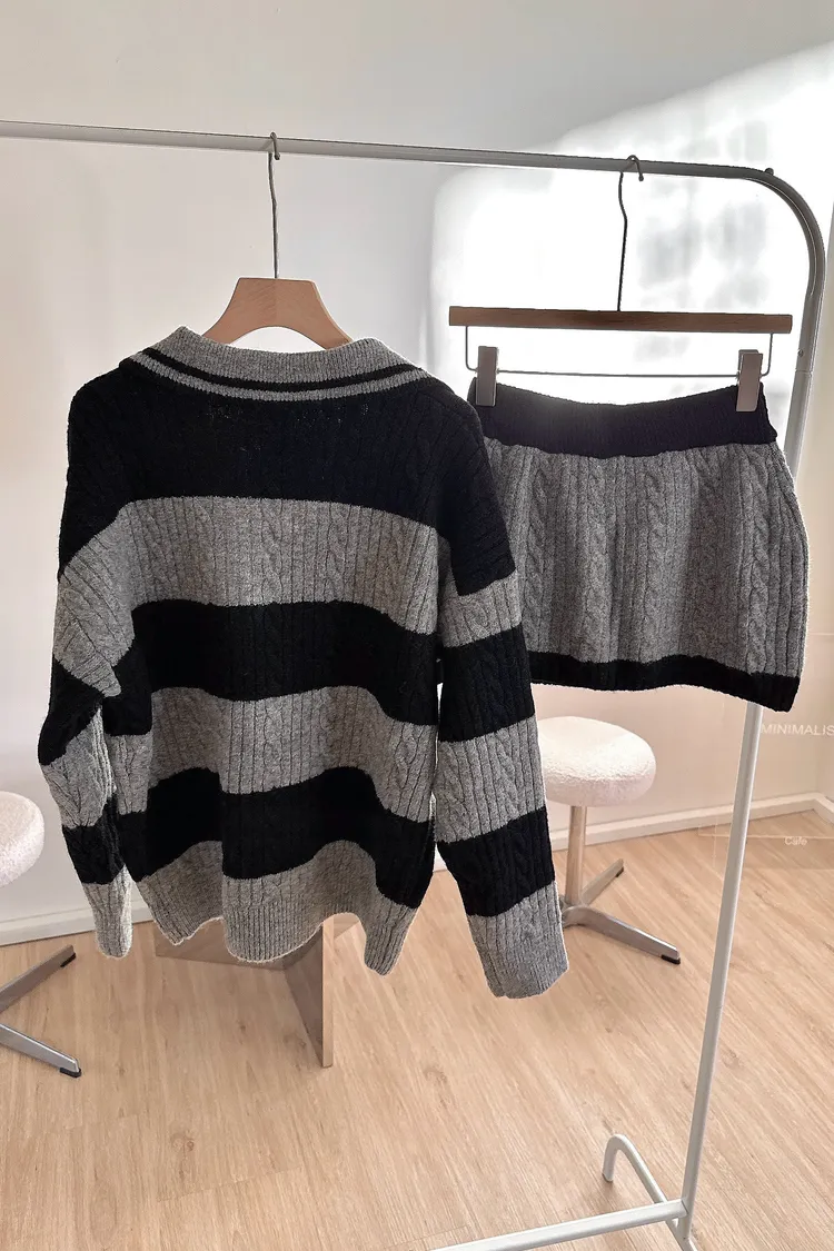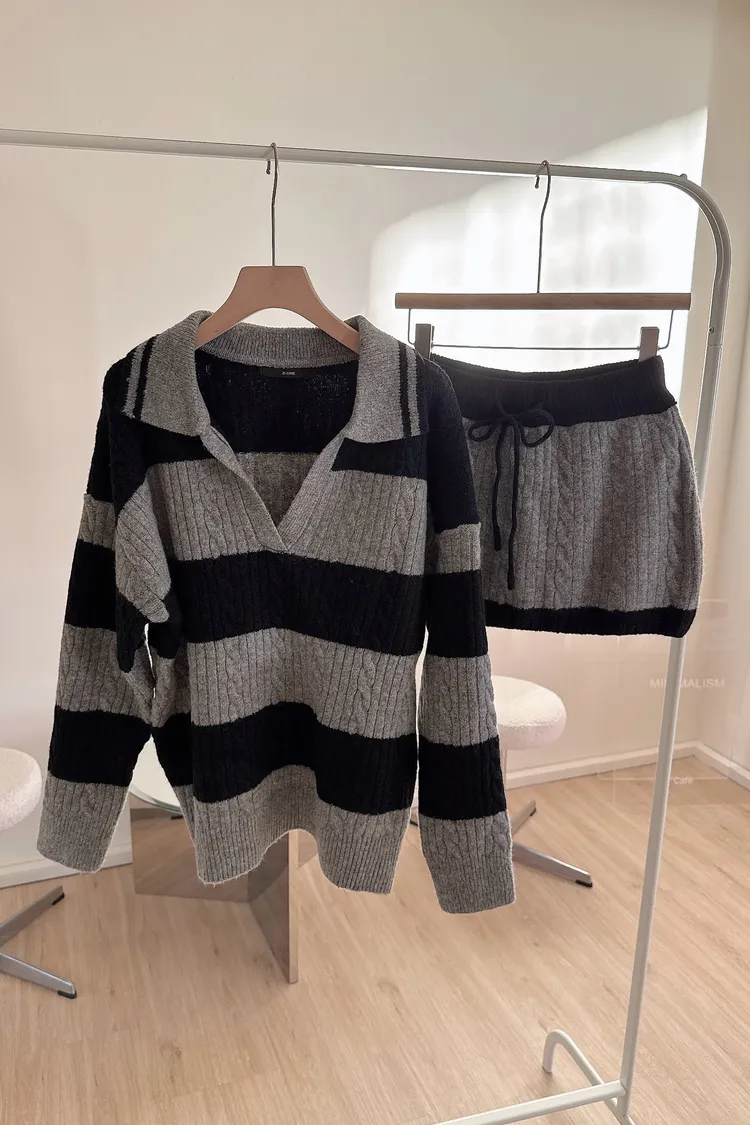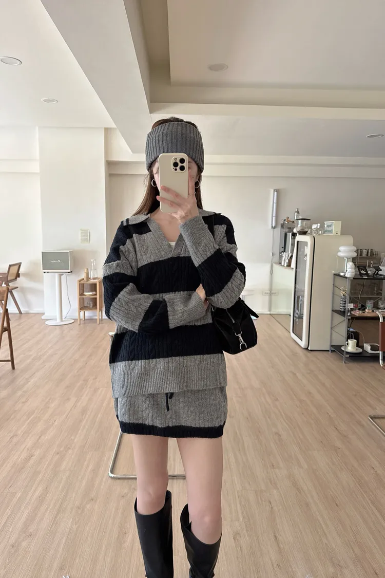 冬𝐧𝐞𝐰🍁套裝,v領條紋針織衣+針織褲裙,灰