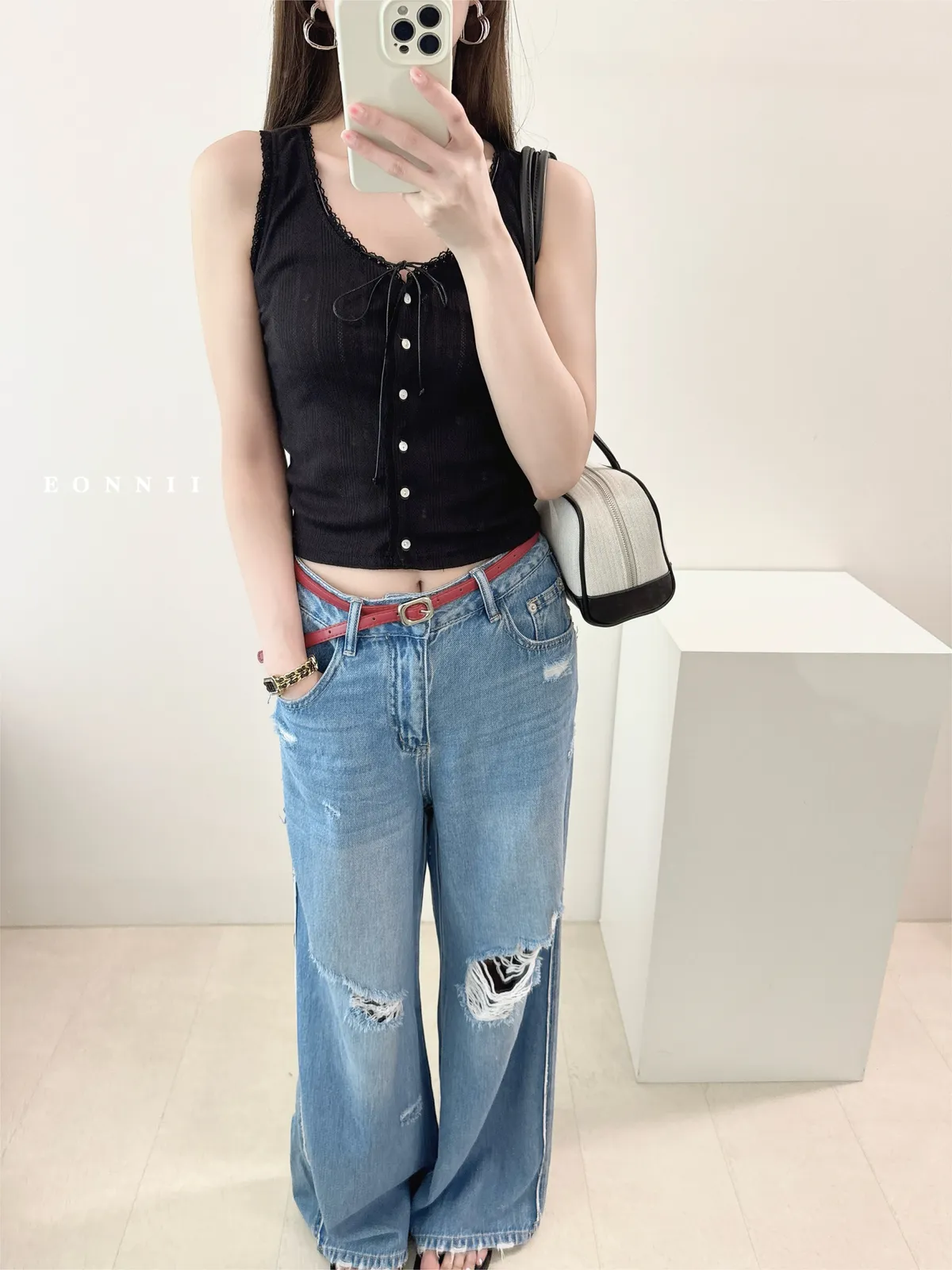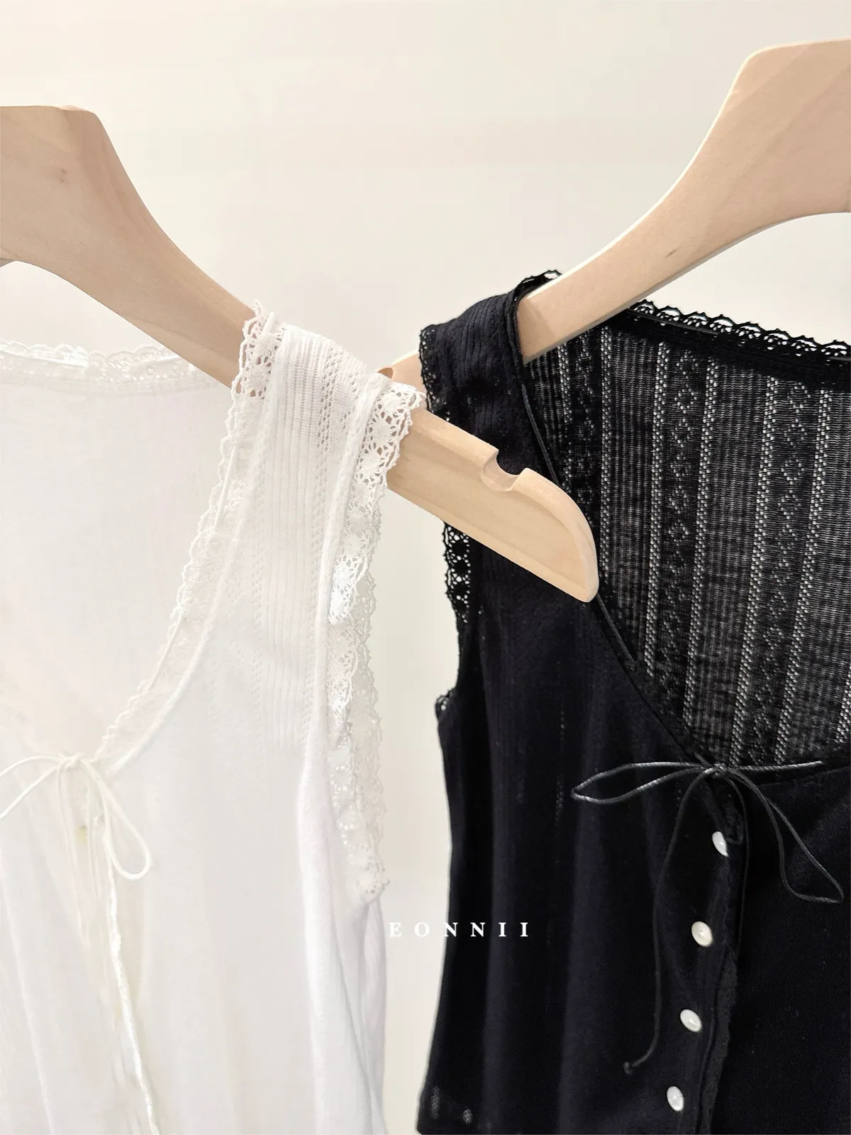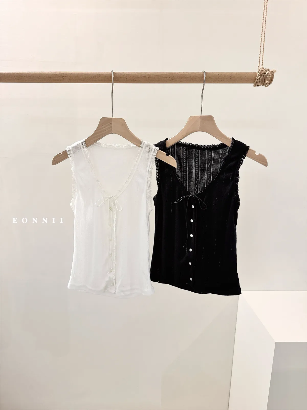 春夏𝐧𝐞𝐰🤍花邊綁結多釦無袖上衣,白/黑(現貨)