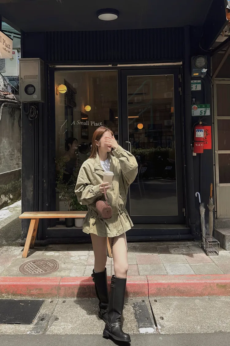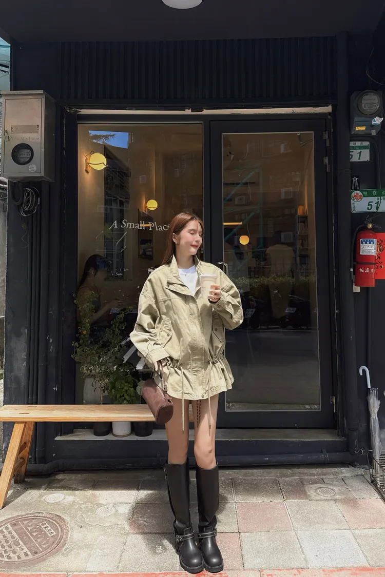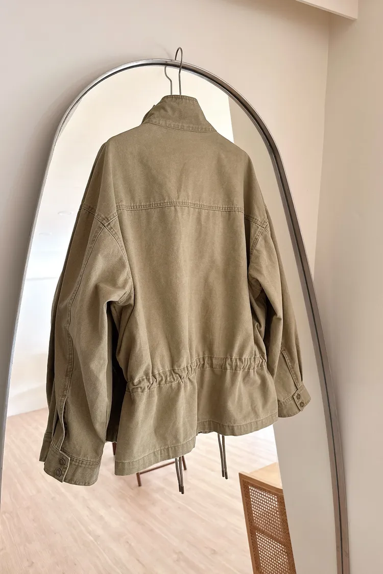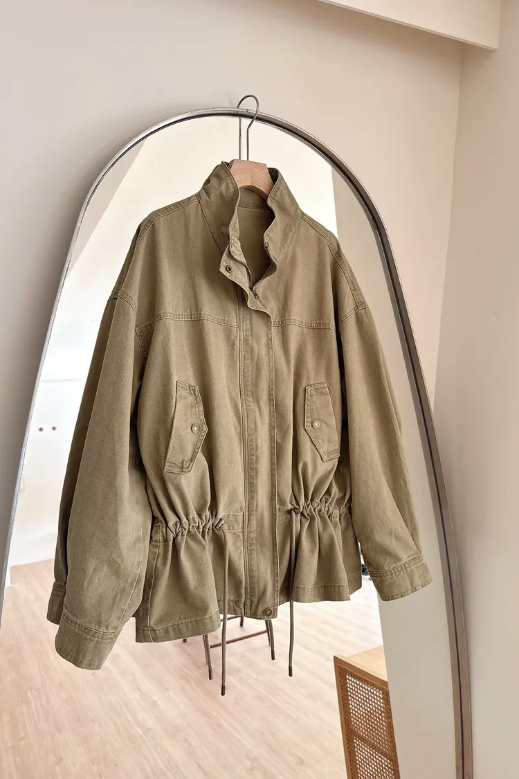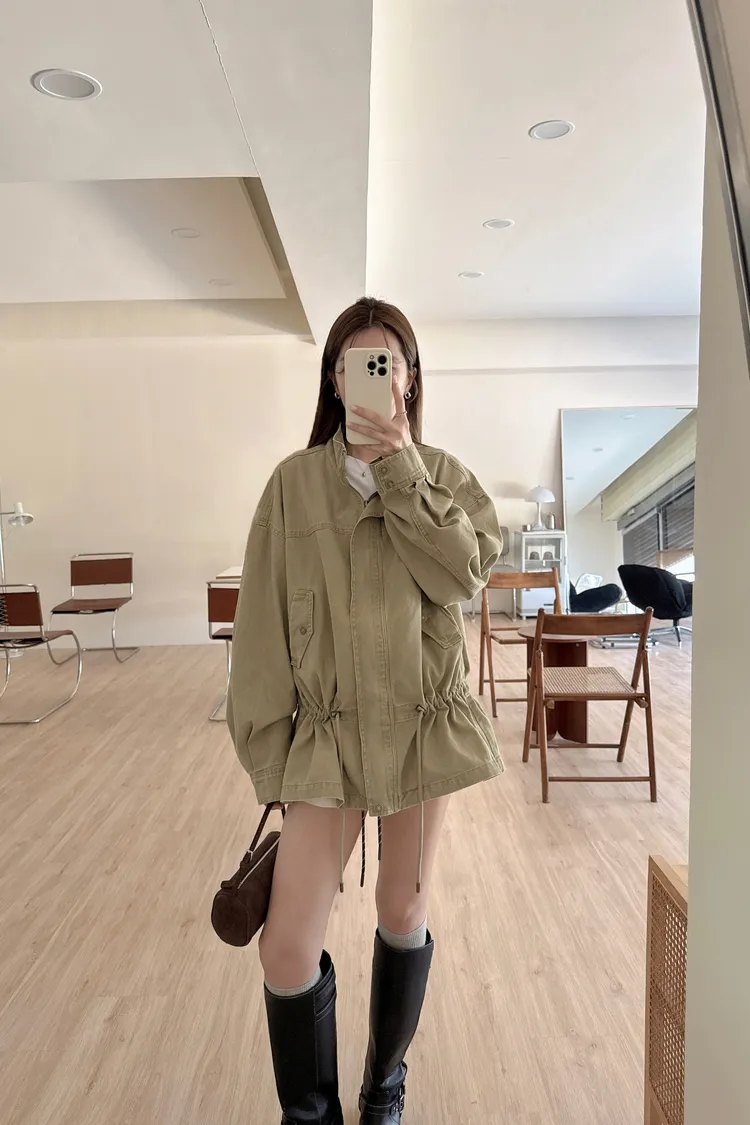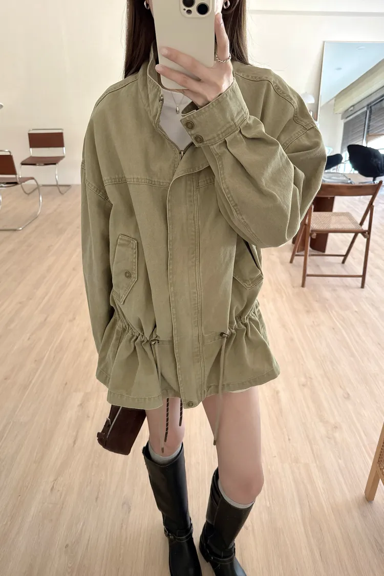秋𝐧𝐞𝐰🍂立領收腰設計感牛仔外套,卡其綠