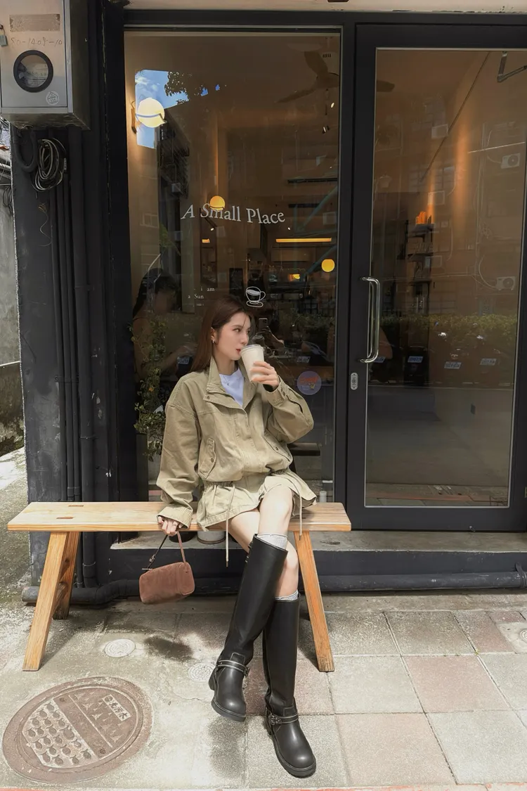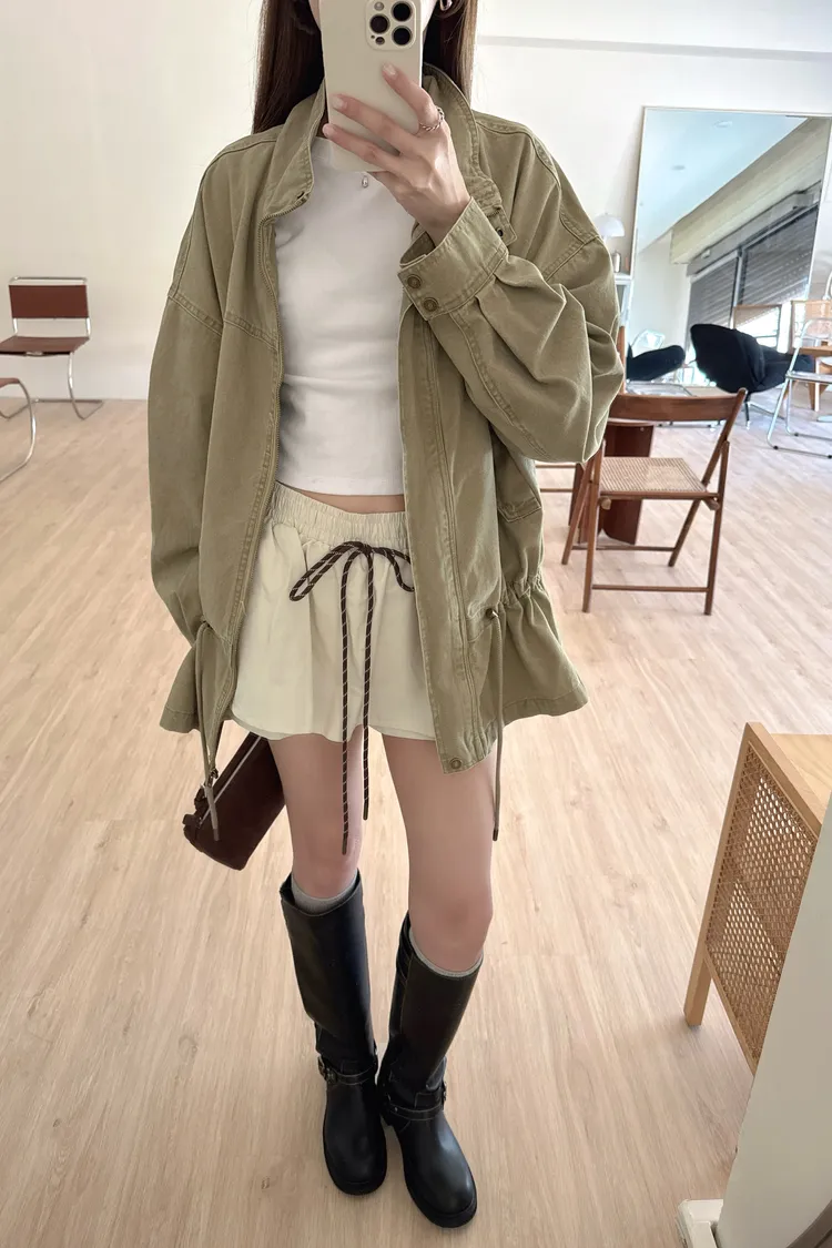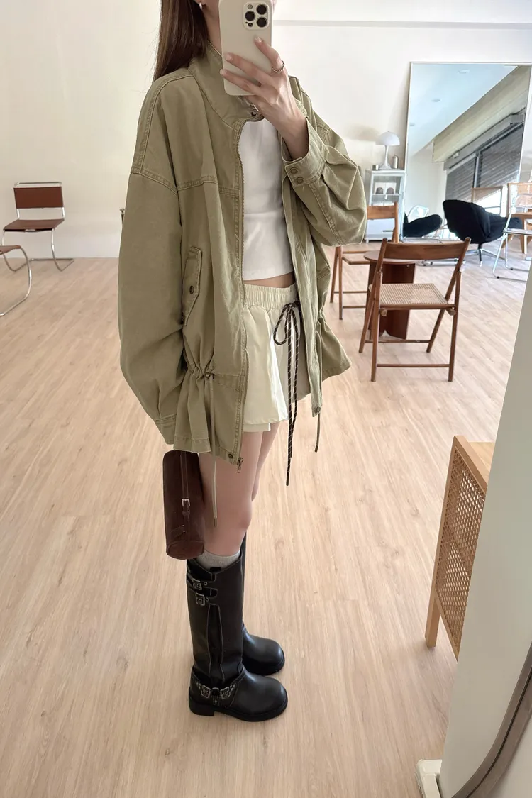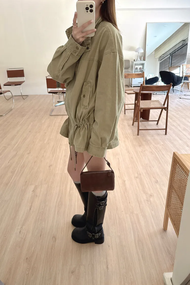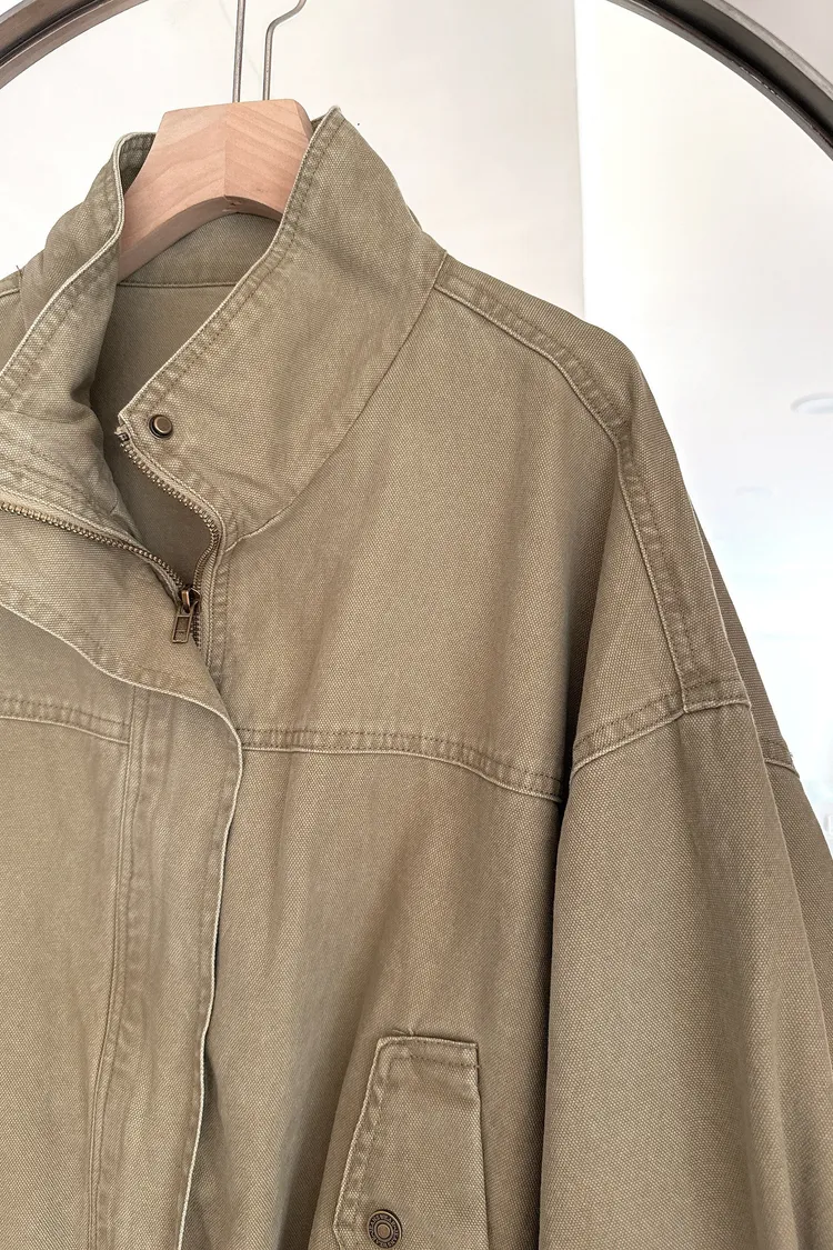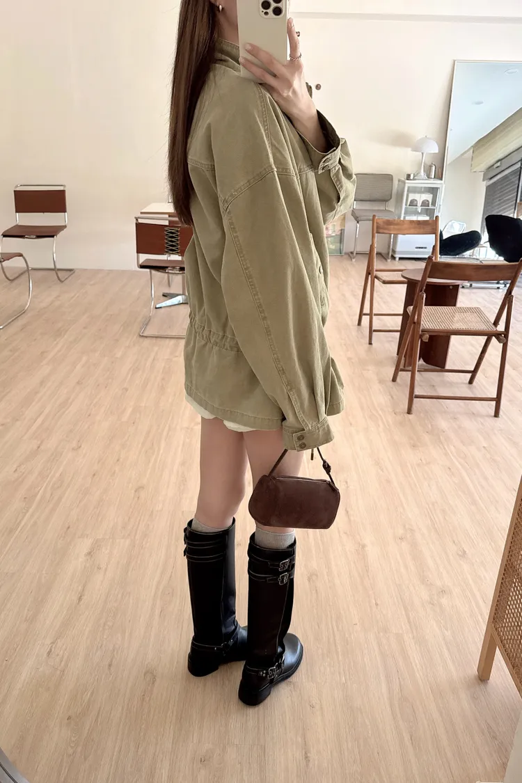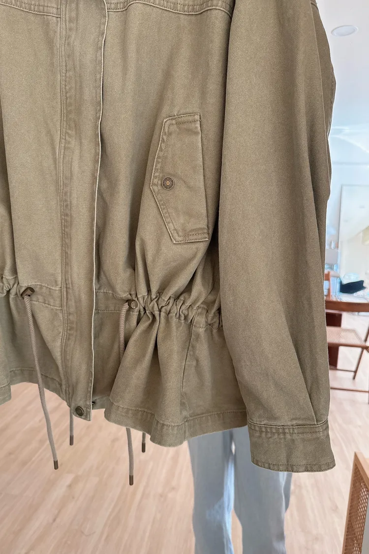秋𝐧𝐞𝐰🍂立領收腰設計感牛仔外套,卡其綠