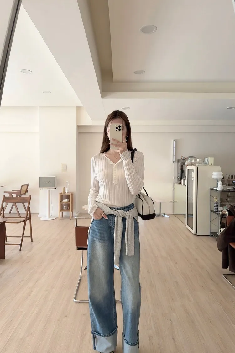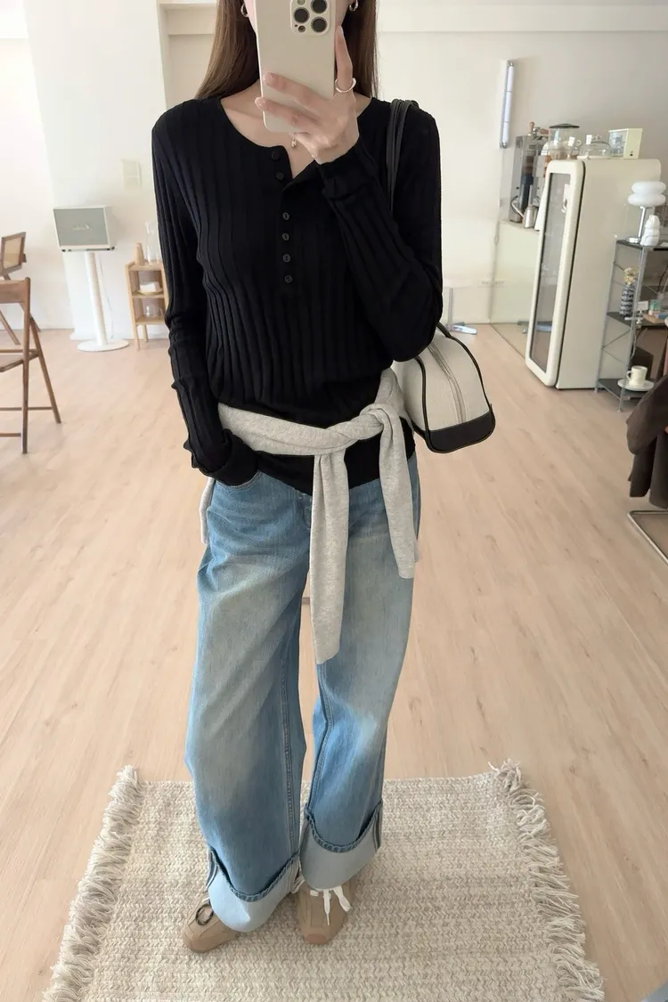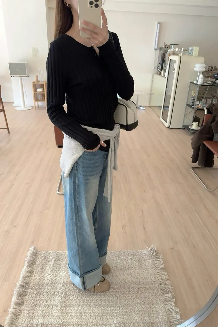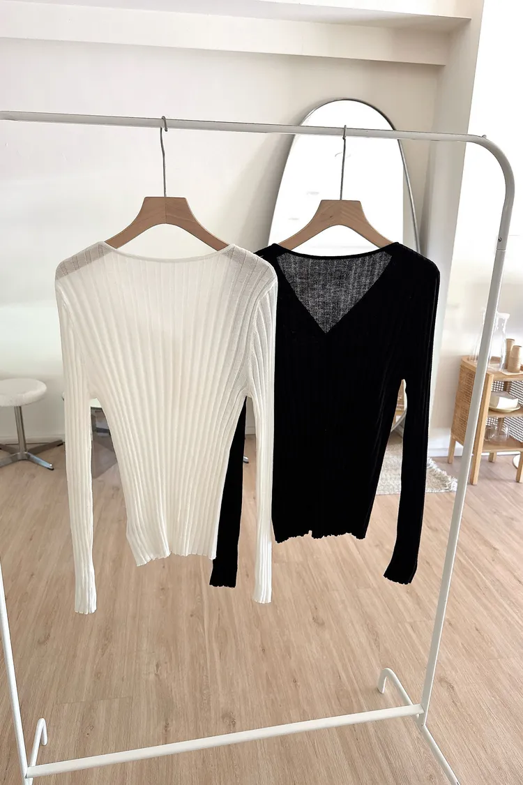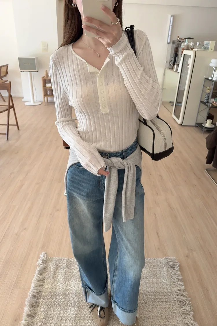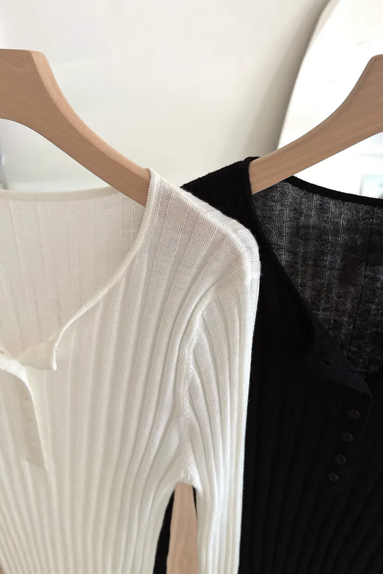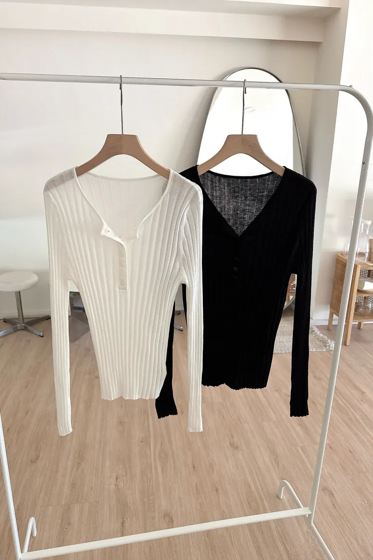 秋𝐧𝐞𝐰🍂坑條多釦針織上衣,米白/黑